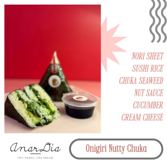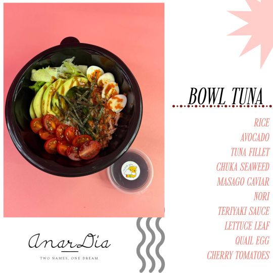 Düyü, avokado, ton balığı filesi, çuka yosunu, masaqo kürüsü, nori, teriyaki sousu, kahı, bildirçin yumurtası, çerri pomidorlar