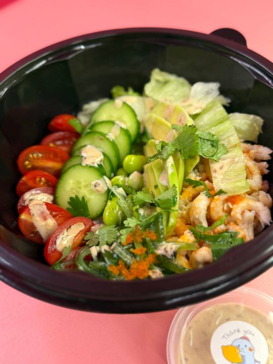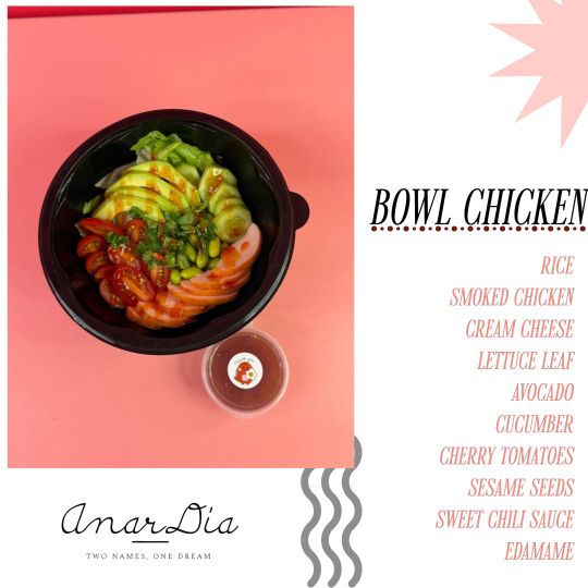 Düyü, tüstülənmiş toyuq, krem pendir, kahı, avokado, xiyar, çerri pomidor, küncüt, şirin çili sousu, edamame