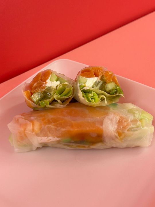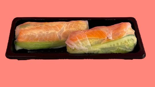 Nori yarpağı, suşi düyüsü, mayonez, tüstülənmiş losos, xiyar, krem pendir